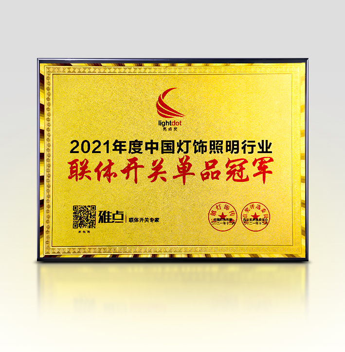 雅點開關(guān),獲得2021年度中國燈飾照明行業(yè)“聯(lián)體開關(guān)單品冠軍”的榮譽,實至名歸!